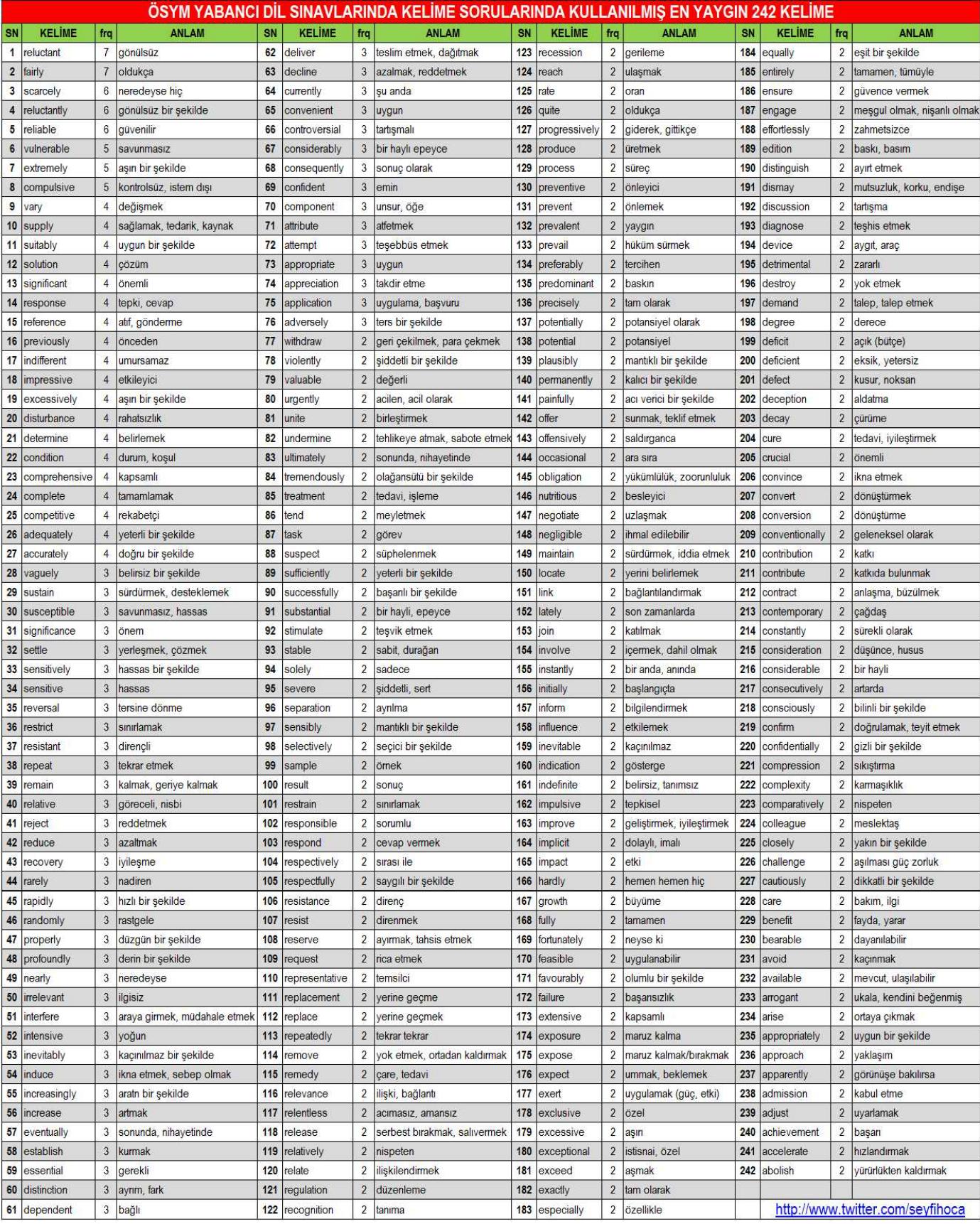 ÖSYM Yabancı Dil Sınavlarında Kelime Sorularında Kullanılmış En Yaygın 242 Kelime – DİLSEM