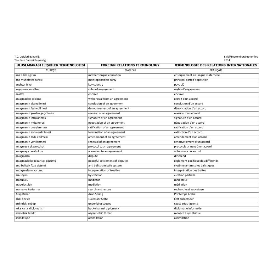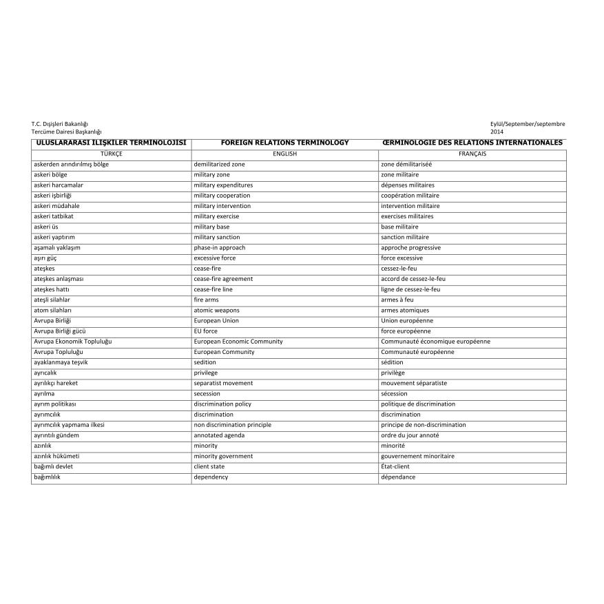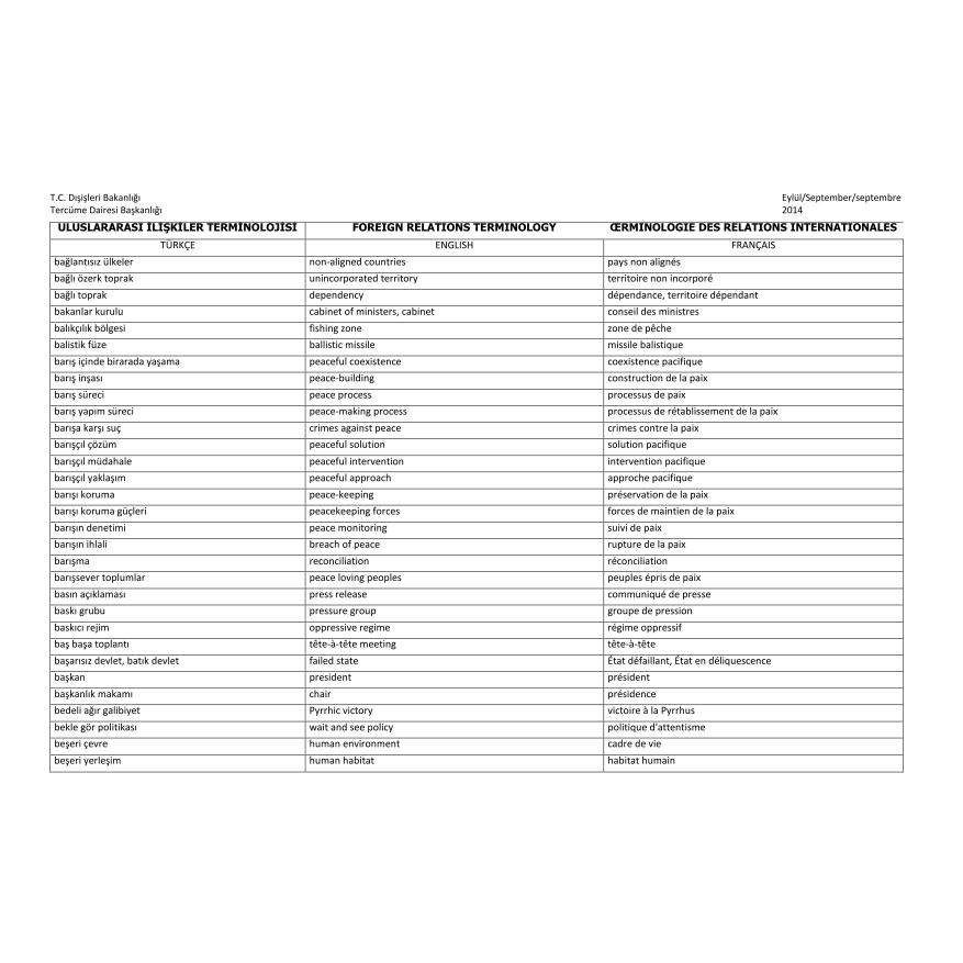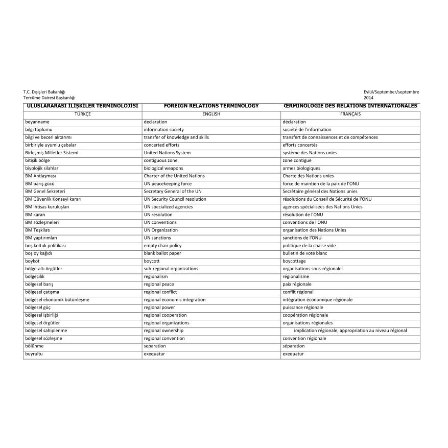Sözlük Uluslararası İlişkiler Terminolojisi – Türkçe/İngilizce/Fransızca Uluslararası İlişkiler Terminolojisi – Türkçe/İngilizce/FransızcaRelated posts:Açıklamalı Afet Yönetimi Terimleri SözlüğüMaliye Bakanlığı - İç Kontrol Kavramlar SözlüğüKamu İnternet Siteleri Rehberi - Sözlükİklim Değişikliği Karbon Proje ve Piyasası Terimler SözlüğüAkıllı Ulaşım Sistemleri Terimleri Sözlüğü